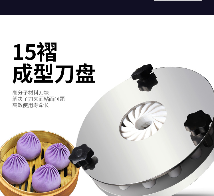 ◆包子成型系統(tǒng):采用成型盤垂直上下移動,配合刀塊張合防止以前包子機做大包子成型堵面的現(xiàn)象。15塊進口高分子材料刀塊充分利用力學(xué)原理均衡受力減小摩擦,完善了其它包子機成型刀塊靠一塊主刀推動其它14塊副刀運動易磨損,刀夾面粘面,易受天氣變化而熱脹冷縮不能正常生產(chǎn)的難題。生產(chǎn)穩(wěn)定大大延長成型刀塊使用時間。