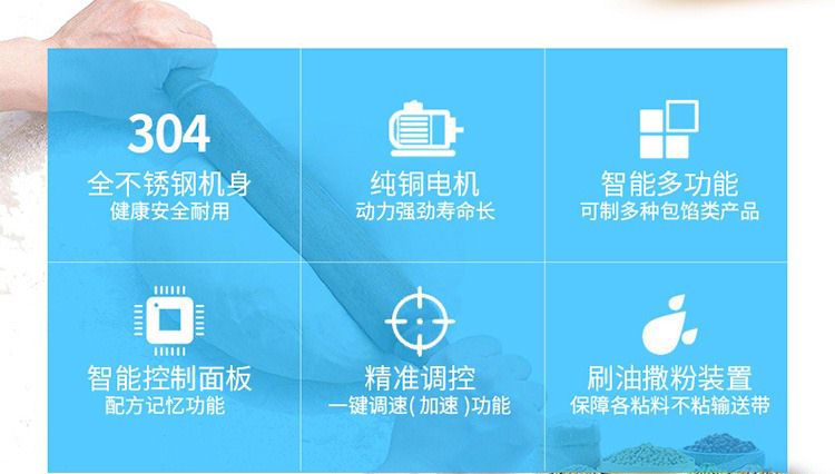 SZ-65型多功能自動(dòng)包餡機(jī)采用臥式輸面、立式輸餡系統(tǒng),運(yùn)行流暢,效率高??缮a(chǎn)豆沙、蓮蓉、五仁餡等較干餡料的包餡類產(chǎn)品,制出的產(chǎn)品餡、皮比例可任意調(diào)整,制品大小統(tǒng)一,外形美觀。