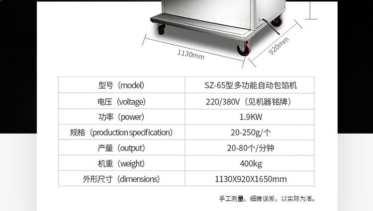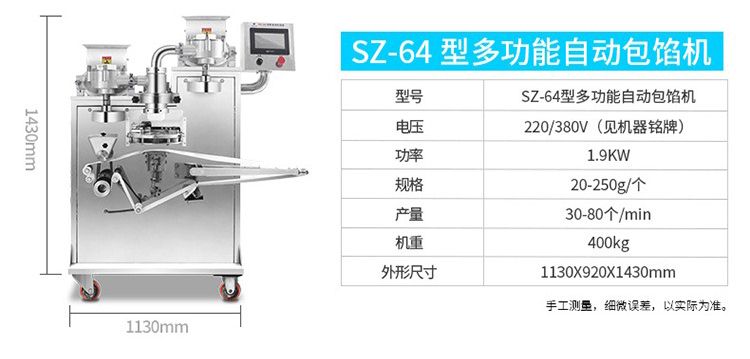 SZ-65型多功能包餡機(jī),可生產(chǎn)豆沙、蓮蓉、五仁餡等較干餡料的包餡類產(chǎn)品,制出的產(chǎn)品餡、皮比例可任意調(diào)整,制品大小統(tǒng)一,外形美觀。
