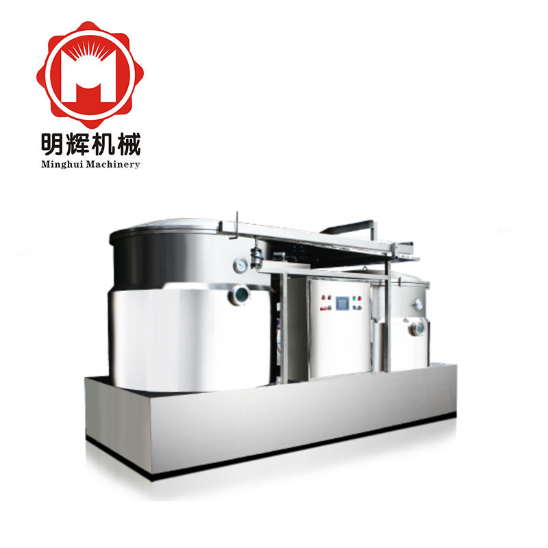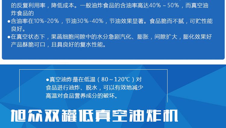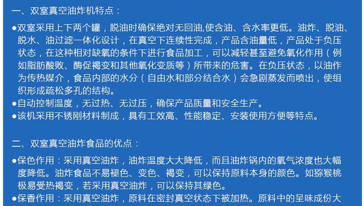 ●雙室采用上下兩個罐,脫油時確保絕對無回油,使含油、含水率低。油炸、脫油、脫水、油過濾一體化設(shè)計,在真空下連續(xù)性完成,產(chǎn)品含油量低,產(chǎn)品處于負(fù)壓狀態(tài),在這種相對缺氧的條件下進行食品加工,可以減輕甚至避免氧化作用(例如脂肪酸敗、酶促褐變和其他氧化變質(zhì)等)所帶來的危害。在負(fù)壓狀態(tài),以油作為傳熱媒介,食品內(nèi)部的水分(自由水和部分結(jié)合水)會急劇蒸發(fā)而噴出,使組織形成疏松多孔的結(jié)構(gòu)。
